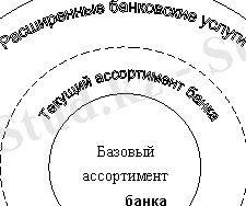 Второй уровень представляет собой банковскую услугу в реальном исполнении - текущий ассортимент банка. Текущий ассортимент постоянно меняется и развивается, не затрагивая базовой направленности банка.