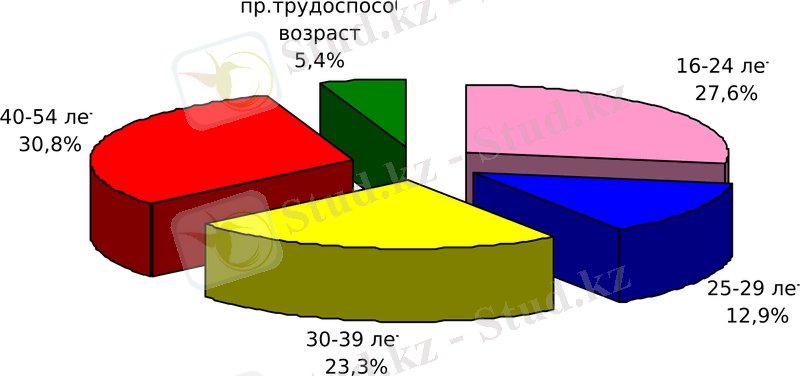 В возрастной структуре населения преобладает молодая его часть. На население моложе 30 лет приходится 52, 4%. Дети в возрасте до 15 лет занимают 26, 2% населения страны. Лица трудоспособного возраста, к которому относятся мужчины 16-63 лет и женщины 16-58 лет, составляют 63, 4% , а пенсионеры - 10, 4% в составе населения страны.