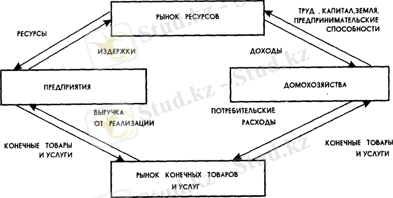 Сферу обмена можно представить как движение двух встречных потоков: товаров и денег. В качестве товаров могут выступать как конечные продукты и услуги, так и ресурсы. Поэтому рынок регулирует движение конечных товаров и услуг, потребителями которых выступают домохозяйства, а производителями - предприятия, и товаров-ресурсов - труда, капитала, земли, предпринимательских способностей, которые поставляют на рынок домохозяйства, а покупают предприятия. Наглядно это можно представить схемой кругооборота товаров и денег (рис. 1) . 2