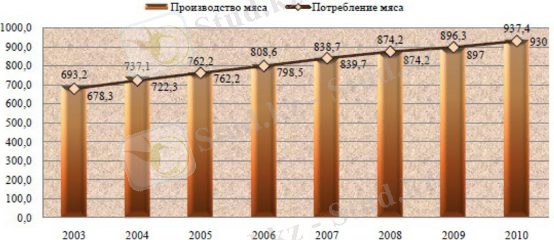 Рисунок 2 - Производство мяса в убойном весе в Казахстане и его потребление (тыс. тонн) по данным Агентство по Статистике РК