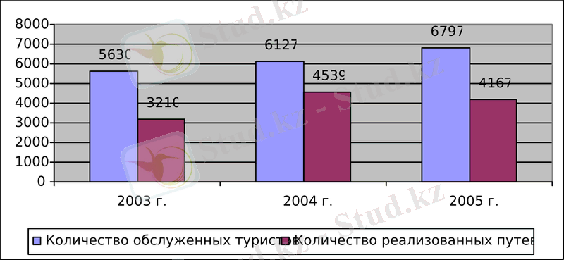 Количество обслуженных туристов в течение последних трех лет увеличилось в среднем на 10 % в год, составив в 2005 году - 6 797 человек. Количество реализованных путевок, увеличившись в 2004 году на 41 % по сравнению с 2003 годом, снизилось в 2005 году на 8 %.