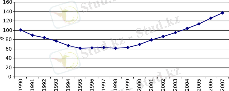 Со времени приобретения Казахстаном суверенитета в 1991г. в республике осуществлялась масштабная трансформация прежней централизованной командной системы в современную экономическую систему рыночного типа. в этот период с 1991 до 1995г. реальный ВВП упал на 39%, резко снизился объем экспорта. К концу 90-х годов Казахстан, преодолев макростабилизационный этап, вышел на траекторию устойчивого развития. стремительное выздоровление началось в 2000 году и продолжилось вплоть до 2004 года (рис. 1) . Него движущим сектором был нефтяной сектор, куда направлялись основные потоки иностранных инвестиций.