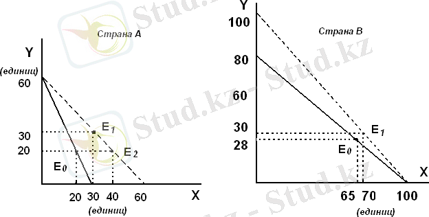 В закрытой экономике товаров потребляются столько, сколько производится. Максимальные объемы потребления заданы точками на кривых производственных возможностей. Предположим, что страна А производит и потребляет 20 единиц товара У и 20 единиц товара X (т. Ео на рис. 1 а), а страна В, соответственно, 65Х и 28У (т. Ео) на рис. 1 б) .