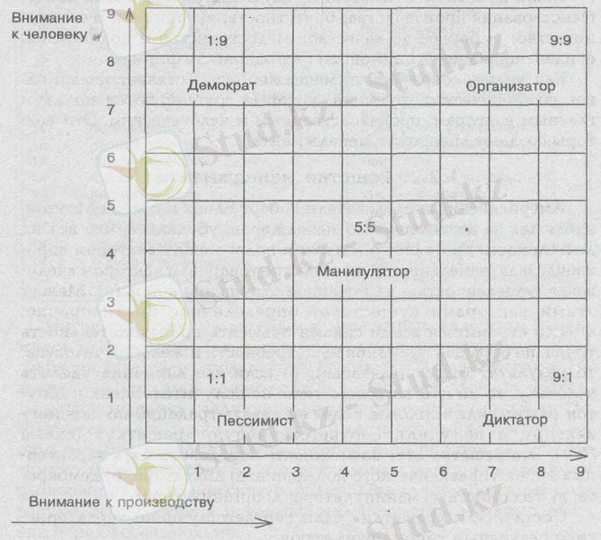Американские исследователи Роберт Блейк и Джейн Моутон, наблюдая за деятельностью менеджеров, убедились, что вся их деятельность протекает в “силовом поле” между вектором “производства” (нацеленность на создание товаров) и вектором “человека” (нацеленностью на гуманное отношение клюдям) . Между этими векторами существует определенное противоречие: а) если стремиться всеми силами повысить производительность труда, не обращая внимания на потребности и желания человека, то результат будет плачевным; б) если все внимание уделить человеку, то ничего хорошего тоже не получится. Блейк и Моутон разграфили “силовое поле” на девять градаций по каждому вектору и получили соответствующую “решетку” (схема № 1) . Эта решетка дает возможность определить пять характерных типов управленческого поведения: а) диктатора; б) демократа; в) пессимиста; г) манипулятора; д) организатора.