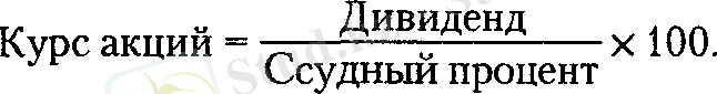 Сумма, обозначенная на акции, составляет ее номинальную стоимость. Купля-продажа акций происходит не по номиналу, а по ценам, стихийно складывающимся на рынке ценных бумаг. Цена, по которой акции продаются и покупаются, называется курсом акций. Этот курс тем больше, чем выше дивиденд, выплачиваемый по акции. Одновременно при покупке акции владелец денежного капитала всегда сравнивает получаемый по ней дивиденд с доходом, который он может гарантированно получать, положив свои деньги в банк, т. е. со ссудным процентом. Чем выше уровень процента, тем ниже курс акций, и наоборот. Курс акций исчисляется по такой формуле: