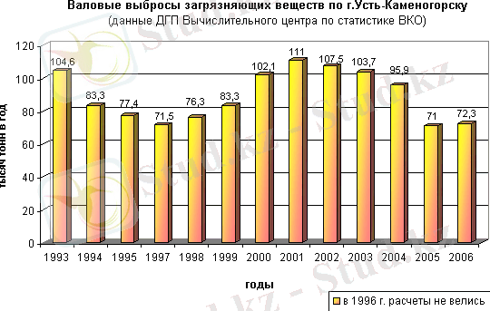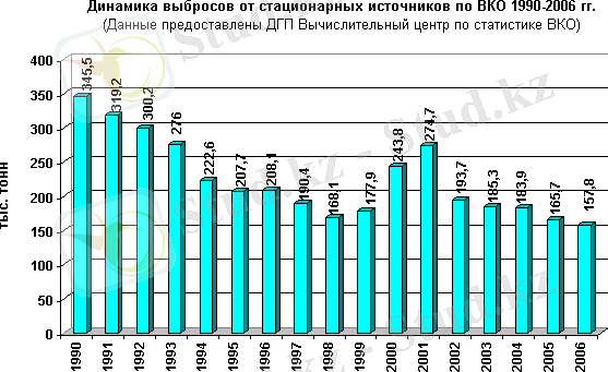 Десятилетний анализ выбросов загрязняющих веществ от стационарных источников в атмосферу ВКО показывает постепенное увеличение количества выбросов с 1997 г. по 2001 г. и снижение и стабилизацию в 2002-2006 гг.