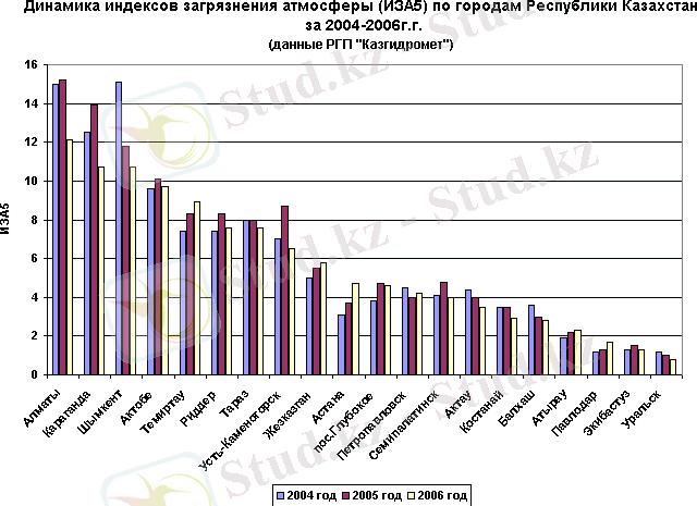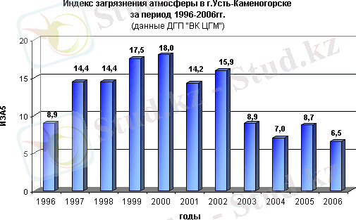 По данным ВК центра гидрометеорологии для города Усть-Каменогорска индекс загрязнения атмосферы в 2006г. по сравнению с прошлым годом снизился с 8, 7 до 6, 5.