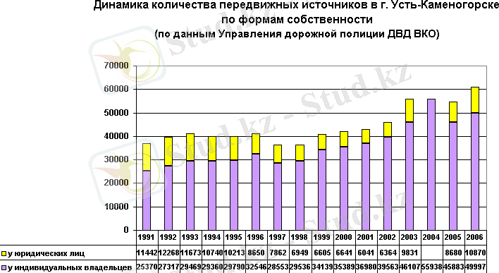 В последние годы положение осложнилось тем, что резко возросло воздействие автотранспорта на атмосферу города Усть-Каменогорска. Статистика показывает, что в городе ежегодно регистрируется от 2 до 3 тыс. транспорных средств. В 2006 году в городе насчитывалось 43 861 единиц легкового и 10 157 единиц грузового транспорта (всего - 54 018 единиц) .