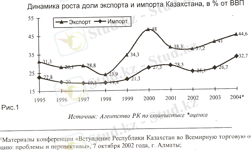 Знакомство с некоторыми основными статистическими показателями дает представление о значении внешнеэкономической деятельности для Казахстана. На рисунке 1 даны показатели удельного веса казахстанского экспорта и импорта, рассчитанные в процентах к ВВП за период с 1995-2003 г. г.