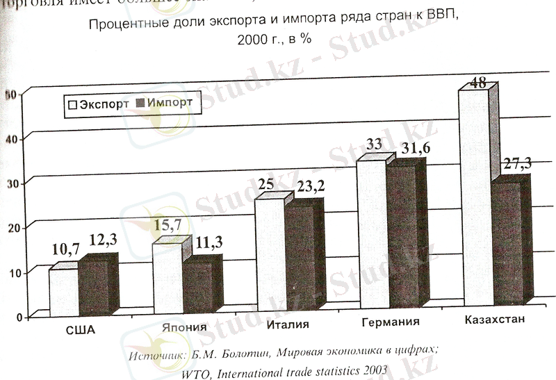 Кроме того, если обратить внимания на долю экспорта и импорта некоторых стран в объеме ВВП, то США, в силу своих размеров и многообразия имеющихся ресурсов, фактически оказываются менее зависимыми от международной торговли, по сравнению с другими развитыми странами. Это означает, что для остального мира, и тем более для Казахстана, доля экспорта которого к ВВП составила в 2000 г. 48 %, международная торговля имеет большее значение, чем для США. (рисунок-2)