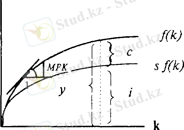 Необходимым условием равновесия экономической системы является равенство совокупного спроса и предложения. Предложение описывается производственной функцией с постоянной отдачей от масштаба: Y=F(K, L) и для любого положительного z верно: zF(K, L) = F(zK, zL) . Тогда если z=1/L, тоY/L=F(K/L, 1) . Обозначим (Y/L) через у, а (K/L) через к и перепишем исходную функцию в форме взаимосвязи между производительностью и фондовооруженностью () : у=ƒ(k) (см. рис. 1) . Тангенс утла наклона данной производственной функции соответствует предельному продукту капитала (МРК), который убывает по мере роста фондовооруженности (k) .