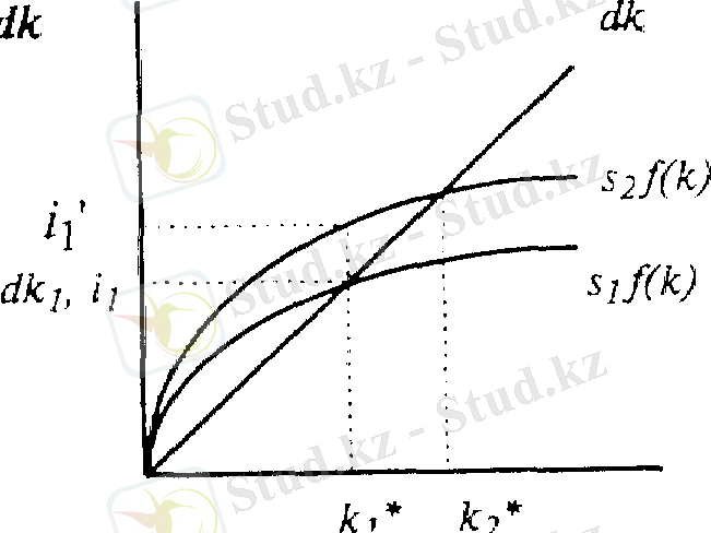 Равновесие является устойчивым, поскольку независимо от исходного значения к экономика будет стремиться к равновесному состоянию, т. е. к k*. Если начальное k1 ниже k*, то валовые инвестиции (sƒ(k) будут больше выбытия (dk) и запас капитала будет возрастать на величину чистых инвестиций. Если k2>k*, это означает, что инвестиции меньше, чем износ, а значит запас капитала будет сокращаться, приближаясь к уровню k* (см. рис. 2) . Норма накопления (сбережения) непосредственно влияет на устойчивый уровень фондовооруженности. Рост нормы сбережения с s1 до s2 сдвигает кривую инвестиций вверх из положения s1ƒ(k) до s2(k) (см. рис. 3) .