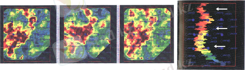 Рисунок 5. Карта разности интенсивности отражений (1999 - 1992) по основному отражению резервуара. Красный цвет отмечает усиление яркости отражения. Голубой цвет отмечает потускнение отражения.
