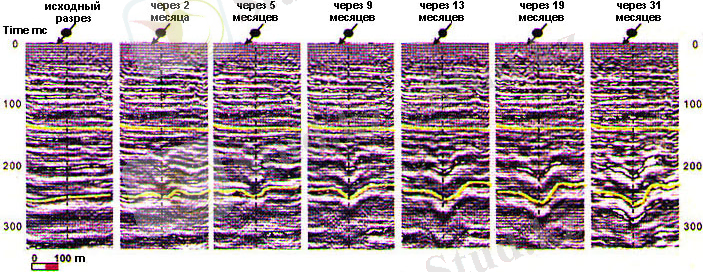 Аналогичные работы проводились в Индонезии на нефтяном поле Duri Field, где действие инъекции пара контролировалось повторением съемок 3D через 2, 5, 9, 13, 19 и 31 месяц (рисунок 3) .