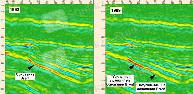 На рисунке 4 показан эффект добычи на сейсмические данные, полученные по профилю, проходящему через структуру Альфа в Северном море. Сверху в залежь закачивалась вода, а снизу - газ. При замещении нефти газом происходит усиление яркости сейсмических отражений, а при замещении нефти водой - наоборот, потускнение отражения.