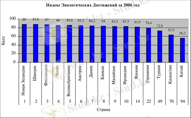 Первая десятка государств, добившихся наибольших успехов в экологической сфере: Новая Зеландия (88), Швеция (87, 8), Финляндия (87), Чехия (86), Великобритания (85, 6), Австрия (85, 2), Дания (84, 2), Канада (84), Малайзия и Ирландия (по 83, 3) . В экологическом рейтинге мира Казахстан занял 70 место из 133-х стран (63, 5) .