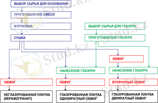 При производстве современной плитки применяются более разнообразные технологии, позволяющие получить материалы практически любых цветов, форм и размеров. Несмотря на свое огромное разнообразие абсолютное большинство керамических изделий можно разделить по способу производства на три группы. Это - неглазурованные плитки (в основном керамический гранит, он же «gres porcellanato» (итал. ) ), глазурованные плитки двукратного обжига (как правило, настенная плитка) и глазурованные плитки однократного обжига. Технология их производства во многом схожа, но имеется и ряд принципиальных отличий.