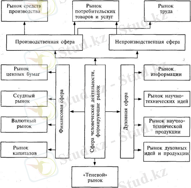 Каждая из сфер человеческой деятельности формирует отдельные элементы национального рынка, представляющие в реальной действительности единое целое. Они между собой взаимосвязаны и взаимозависимы. Так, например, производственная сфера и сферы нематериальных благ и услуг формируют рынки: средств производства, потребительских товаров и услуг, рабочей силы.