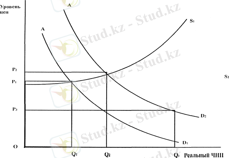 Это увеличивает объем национального продукта до величины Q 2 и уровень цен до Р 2 , то есть ускорится темп инфляции.