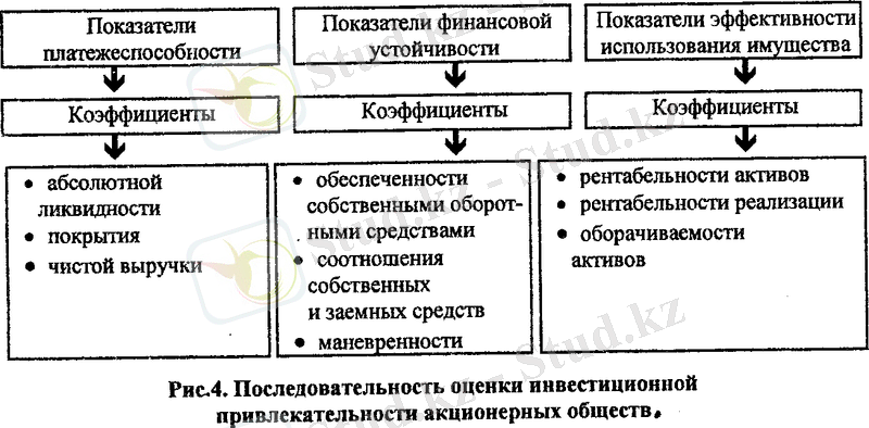 Изучение практики казахстанских предприятий, экономической литературы и международного опыта показало, что используемые в республике методы анализа деятельности предприятий предполагают слишком большое количество коэффициентов, которые не носят системного характера. Применительно к сегодняшним хозяйственным условиям достаточно использовать только часть предлагаемых показателей, в частности, те, которые могли бы стать основой для принятия управленческих решений. При этом необходимо соблюдать логику оценки инвестиционной привлекательности, которую целесообразно проводить в последовательности, указанной на рисунке 1.