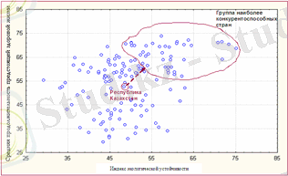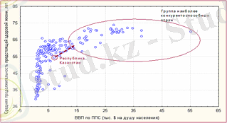Казахстан занимает 80 место в рейтинге стран по индексу развития человеческого потенциала (ИРЧП) . Положение Республики Казахстан среди основных стран мира по таким составляющим этого индекса, как средняя продолжительность предстоящей здоровой жизни и величина валового внутреннего продукта на душу населения, иллюстрируется рисунком 2.