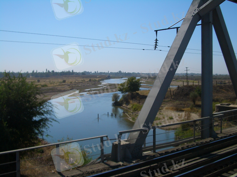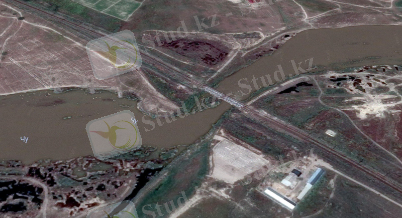 На пути железнодорожной линии на км 3747 пк 6+10 стоит металлического моста через р. Шу по схеме 2х 45. 5 длиной 86 м.
