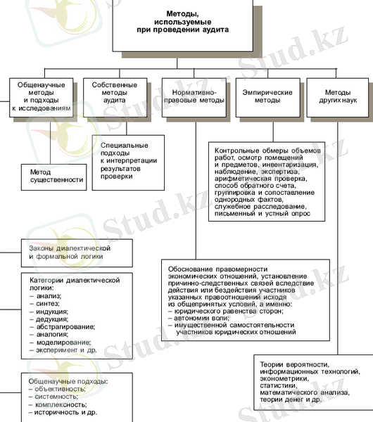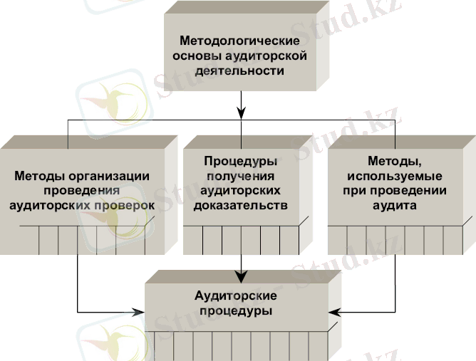 Как в среде практикующих аудиторов, так и среди научных работников принято считать, что методы аудита содержатся в стандартах аудиторской деятельности. Строго говоря, это не совсем так. Действительно, некоторые рекомендации о методах организации проведения аудита, сбора аудиторских доказательств содержатся в ряде казахстанских стандартов аудиторской деятельности, таких как: «Аудиторские доказательства», «Аудиторская выборка», «Действия аудитора при выявлении искажений бухгалтерской отчетности», «Использование работы эксперта». Но методы организации проведения аудита, методы сбора аудиторских доказательств - это, строго говоря, не есть методы аудита. Нельзя считать методами аудита и аудиторские процедуры. Общая схема взаимосвязи методов и процедур, используемых в аудиторской деятельности, а также место в ней методов аудита представлены на рис. 1.