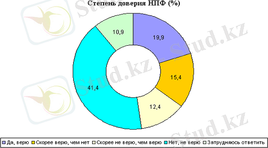 Несомненно, что условием доверия к пенсионным фондам является наличие уверенности в том, что по достижении пенсионного возраста вкладчик получит свои накопления обратно. Как показывают результаты опроса на вопрос ""Верите ли Вы в то, что будете получать свои пенсионные отчисления по достижении пенсионного возраста?", больше половины вкладчиков ответили, что не верят в перспективу получения пенсионных накоплений по достижении пенсионного возраста (53, 8%) ; количество уверенных в сохранности своих пенсионных сбережений составляет около трети (35, 3%) от числа опрошенных.