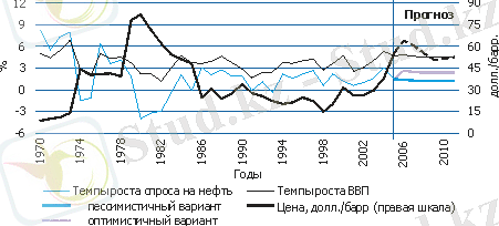 Об ослаблении взаимосвязи между экономическим ростом и спросом на нефть говорят статистические показатели. Например, в период 1970-1986 гг., когда котировки сырой нефти в реальном выражении превышали 40 долл. /барр., достигая в отдельные годы уровня 80 долл. /барр., темпы роста мировой экономики объясняли более 80% повышения спроса на нефть. При этом 4%-ный прирост ВВП увеличивал нефтяной спрос на 10%. Столь высокая зависимость экономики от спросового фактора в определенной степени объясняла резкое увеличение цен в тот период. В условиях рыночной экономики производители использовали любые возможности для развития энергосберегающих технологий. В результате за последние почти двадцать лет коэффициент эластичности в линейной зависимости снизился с 2. 5 до значения менее 1, объясняя при этом менее 70% всех колебаний спроса.