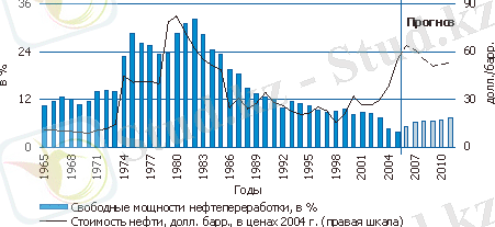 Частично проблему дефицита мощностей можно решить за счет увеличения уровня загрузки уже имеющихся мощностей (отношения пропускной способности НПЗ к фактической мощности нефтепереработки) в различных странах, в том числе в России. В разных странах он составляет чуть более 80% (по данным на 2004 г. ) : например, в Южной и Центральной Америке - 82%, в Европе - 83% и на Ближнем Востоке - 85%. В странах Северной Америки и в некоторых странах АТР этот показатель существенно выше. Низкая производительность (глубина) переработки нефти на старых российских НПЗ2 создает дополнительные возможности в части удовлетворения растущего мирового спроса, однако для этого также необходимы инвестиции и время.
