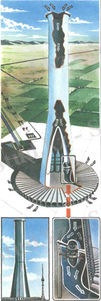 Основа этой установки - большая круглая теплица диаметром 250 м, покрытая специальной пластиковой пленкой. От середины теплицы поднимается 200-метровая труба, в которой установлен электрогенератор с воздушной турбиной.
