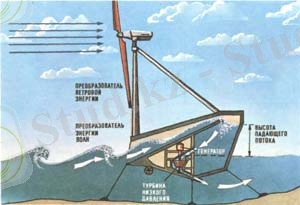 Конструкция предусматривает использование энергии волн и ветра. Волновая часть состоит из наклонной плоскости, по которой набегающие волны перекатываются в верхний резервуар. Затем вода из резервуара идет на низконапорную турбину, вращающую электрогенератор или компрессор для сжатия воздуха, или рабочее колесо насоса, подающего воду в накопительную емкость. На этом же плавучем понтоне или судне, где смонтирована волновая часть, располагается и энергетическая установка. Такая установка при высоте волн около 2 метров и скорости ветра выше 0, 5 м/с. способна вырабатывать 1, 75 МВт на каждые 100 м воды, попавшей в резервуар (естественно, при росте скорости ветра мощность будет расти) .