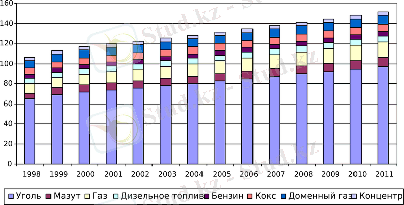 Наибольший вклад в объем выбросов СО 2 вносит энергетика, а из энергоносителей - уголь. Более интенсивными темпами, по прогнозным данным, будет возрастать доля угля и к 2010 году составит 63%, а к 2020 - 66% в объеме валовых выбросов, образующихся от сжигания топлива (рис. 2) . Влияние глобального потепления на экономику Казахстана требует специального изучения.