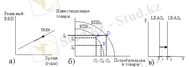 Графически экономический рост может быть представлен тремя способами: через кривую реального ВВП; через кривую производственных возможностей; с помощью модели совокупного спроса - совокупного предложения (модели AD-AS) . На рис. 1. (а) кривая (тренд) отражает долгосрочную тенденцию увеличения реального ВВП. На рис. 1. (б) экономический рост показан с помощью кривой производственных возможностей. На рис. 1(в) представлен как сдвиг вправо долгосрочной кривой совокупного предложения(LRAS) и рост объема производства от Y 1 доY 2.