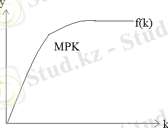 Графическое изображение этой функции имеет вид, показанный на рис. 2. При этом если k увеличивается на одну единицу, то y возрастает на МРК единицу. По мере роста капиталовооруженности труда его производительность увеличивается, но с убывающей скоростью, т. к. МРК снижается /7, с. 256/.