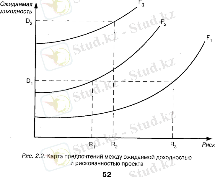 Кривые на карте предпочтений имеют положительный наклон. Изображенные на рисунке кривые носят название «кривых равных предпочтений» или «кривые безразличия», так как каждая из них отражает своими точками равнопредпочтимые для предпринимателя при данном уровне его удовлетворенности пары ожидаемой эффективности и рискованности решения. Приемлемых уровней удовлетворенности (полезности) может быть несколько. На приведенном рисунке их три, из них наиболее низкий из всех приемлемых уровень F 1 , наиболее высокий F 3 . Уровень F 1 ниже, чем уровень F 2 , так при одной и той же ожидаемой доходности решения в первом случае (для F 1 ) величина риска R 3 больше, чем риск R 1 во втором случае (для F 3 ) . Сочетание же ожидаемой рентабельности решения и его рискованности, отвечающее одной из точек кривой равных предпочтений для уровня F 3 , оказывается тогда за счет более высокой ожидаемой доходности вложений в данное решение (хотя и при большем риске) более привлекательным для предпринимателя, соответствует более высокому уровню полезности для него. Карта предпочтений предпринимателя должна быть построена для него либо им самим, либо с помощью сторонних экспертов построена эмпирически, то есть на основе обработки данных анализа решений, которые принимались ранее.
