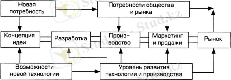 На рисунке 1 представлен простой линейный процесс с упором на роль НИОКР и отношением к рынку лишь как к потребителю результатов технической активности производства.