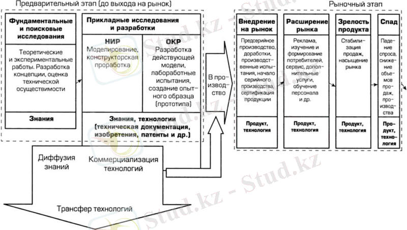 Инновационный процесс можно определить, как процесс последовательного превращения идеи в товар, проходящий этапы фундаментальных, прикладных исследований конструкторских разработок, маркетинга, производства, наконец, сбыта, - процесс коммерциализации технологий.