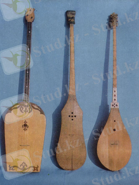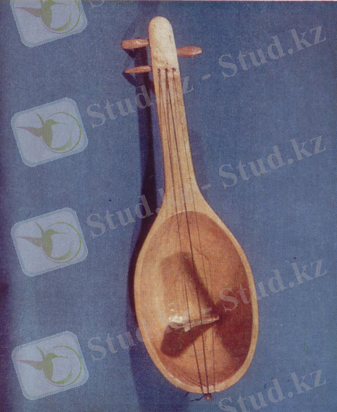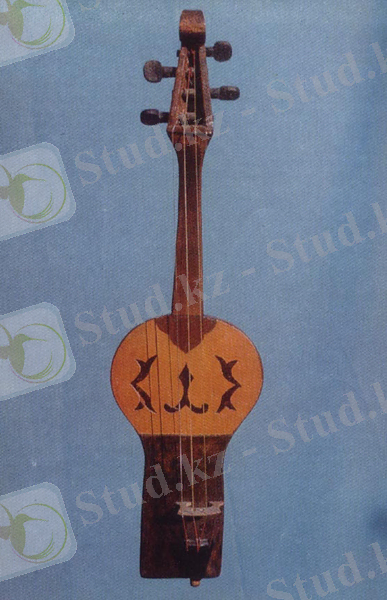 Кобыз - четырехструнный реконструированный смычковый инструмент. Струны металлические и жильные. Звуки извлекаются прижимом ногтя к струнам. Распространен среди профессиональных музыкантов и в художественной самодеятельности. Строй - ми, ля, ре, соль малой октавы. Диапазон - три с половиной октавы. Изготовлен в 1969 году музыкальным мастером К. Оналбаевым (Рис. 3) .