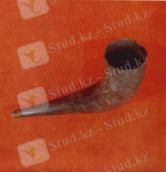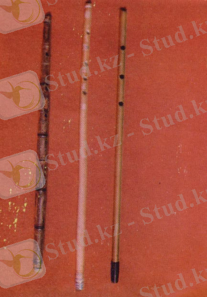Уран - духовой музыкальный инструмент, употреблявшийся воинами. Две различные по длине трубки имеют по три игровых отверстия. Изготовлен по рисунку музыканта, исследователя А. Эйхгорна, который встречал этот инструмент у казахов в 1880-е годы (Рис. 9) .