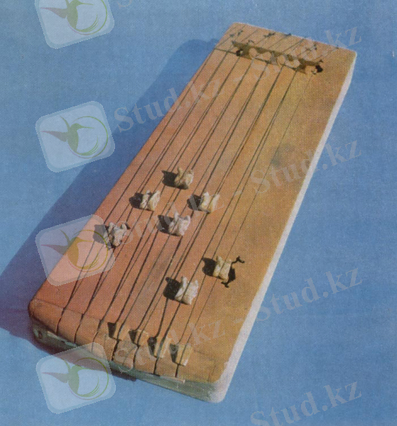 Жетыген - древний семиструнный щипковый музыкальный инструмент. Настраивается передвижением семи асыков (альчиков) . Определенного строя не имеет. Звуки извлекались защипыванием струн. Изготавливался из цельного куска дерева, струны из конского волоса. Настоящий жетыген изготовлен в 1967 году мастером О. Бейсенбаевым по этнографическому описанию (Рис. 4) .