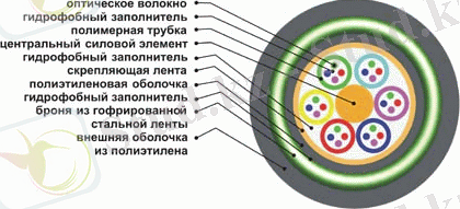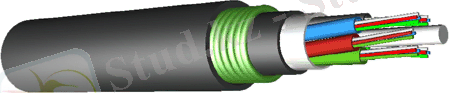 Кабель волоконно-оптический с одномодовым или многомодовым волокном с броней из гофрированной стальной ленты.