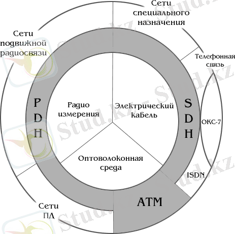 Рассмотрим ту часть первичной, которая связана с передачей информации в цифровом виде. Как видно из рис. 1. 1, современная цифровая первичная сеть может строиться на основе трех технологий: PDH, SDH и ATM.