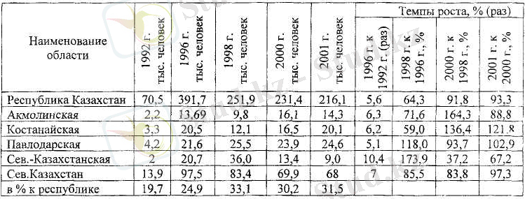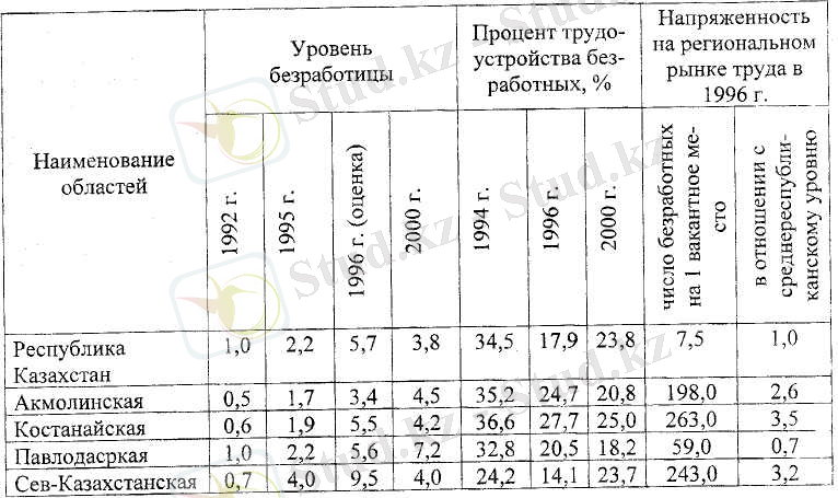 Положение на региональных рынках труда определяется особенностями социально-экономического развития конкретного региона. В условиях рыночных преобразований особенно усиливается зависимость сферы занятости от стабильности общеэкономической ситуации в регионе. В условиях плановой централизованной экономики Северный Казахстан относился к трудонедостаточным районам куда привлекалась значительная рабочая сила в весенне-осенней период на сельскохозяйственные работы. С переходом к рынку положение в сфере занятости кардинально изменилось: во всех областях наблюдается безработица, которая растет значительными темпами (табл. 1) .