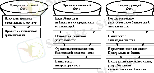 В состав фундаментального блока входит как сам банк, так и правила его деятельности. Банки не только организуют денежное обращение и кредитные отношения: через них осуществляется финансирование народного хозяйства, страховые операции, купля-продажа ценных бумаг, а в некоторых случаях - посреднические сделки и управление имуществом. Кредитные учреждения выступают в качестве консультантов, участвуют в обсуждении народнохозяйственных программ, ведут статистику, создают свои подсобные предприятия [5] .