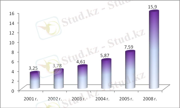 Рисунок 1. Динамика изменения валового внутреннего продукта Республики Казахстан в 2001-2008 гг. (трлн. тенге) (по данным Агентства РК по статистике)
