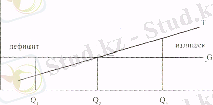 Недискреционная фискальная политика действует на основе механизма автоматических, или встроенных, стабилизаторов (встроенная стабильность) . В данном случае предполагается, что сумма налоговых изъятий варьируется пропорционально величине национального продукта в разных фазах экономического цикла: при подъеме налоговые поступления возрастают, ограничивая спрос, и автоматически сдерживают чрезмерный экономический рост; при спаде, наоборот, налоговые поступления снижаются, смягчая уменьшение национального производства. На схеме 11. 2. показаны эти изменения (линия Т) при условии неизменности величины государственных расходов (линия О) .