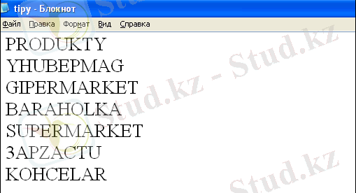 В файле « Ol » тип магазина и улицы даны в виде цифр, чтобы не занимать много места. А при получении информации вместо букв программа считывает улицу и тип с файлов « tipy » и « ulitsa », при помощи процедур okutipy и okuulitsa. Они работают следующим образом: Они считыают число и при выдаче информаций вместо числа выдают улицу расположенную под этим прядковым номером. Так же выдаётся и тип магазинаю. А при добавлений сведении используется также процедуры UlByNumber и TipByNumber. Они работают наоборот, по улице и типу выдают соответствующие числа. А если улицы нет в списке имеющихся то используется процедура AddUl. Возвращает номер соответствующий порядковому номеру улийы в файле.