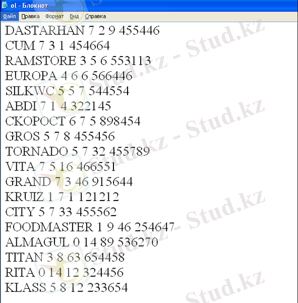 Данные о магазинах хранятся в файле « Ol ». Данные о типах магазина хранятся в файле « tipy ». Данные об улицах на которых находятся магазины хранятся в файле « ulitsa ». Внутри файла « Ol » данные хранятся в виде записей. Каждая новая запись начинается с новой строки. Записи имеют несколько полей. Каждое поле разделено друг от друга пробелом. Первое поле соответствует названию магазина, второе поле - типу магазина, третье поле - улице, на которой расположен магазин, четвёртое поле - номеру дома, пятое поле - номеру телефона.