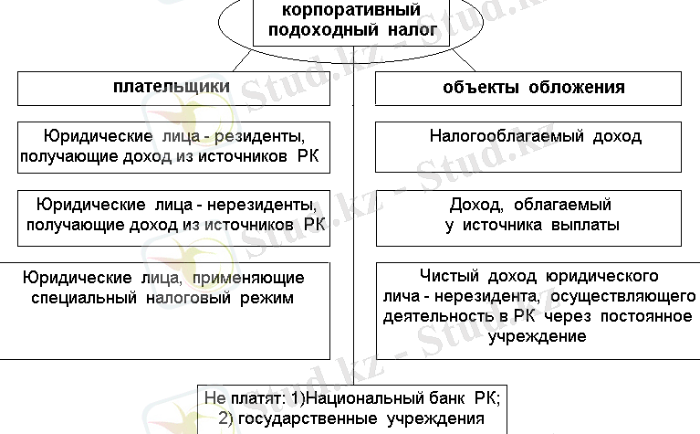 Одним из важных понятий, лежащих в основе деления данного вида налога, является резидентство, которое подразумевает конечную налоговую ответственность юридического лица по месту нахождения, т. е. на территории РК. При этом резиденты налоговой юрисдикции (территории, внутри которой действует соответствующие налоговые законы) облагаются налогами на все доходы из всех источников, включая и зарубежные источники доходов.